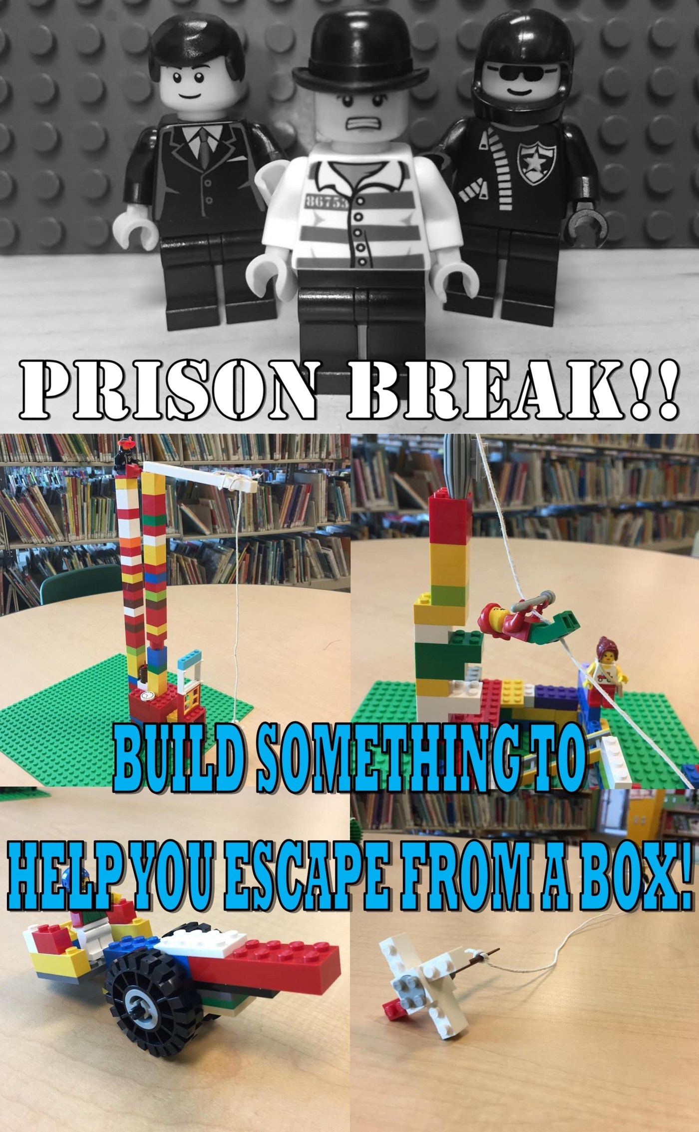 It’s up to the kids to design something to get him out. It can be either practical or imaginary. I was worried I would get 30 different kids making stairs, so after we went over the rules of Lego Club, we brainstormed some quick ideas. And they were off!! I knew some kids would want to make elevators, so as an added bonus I allowed my kids to use string: