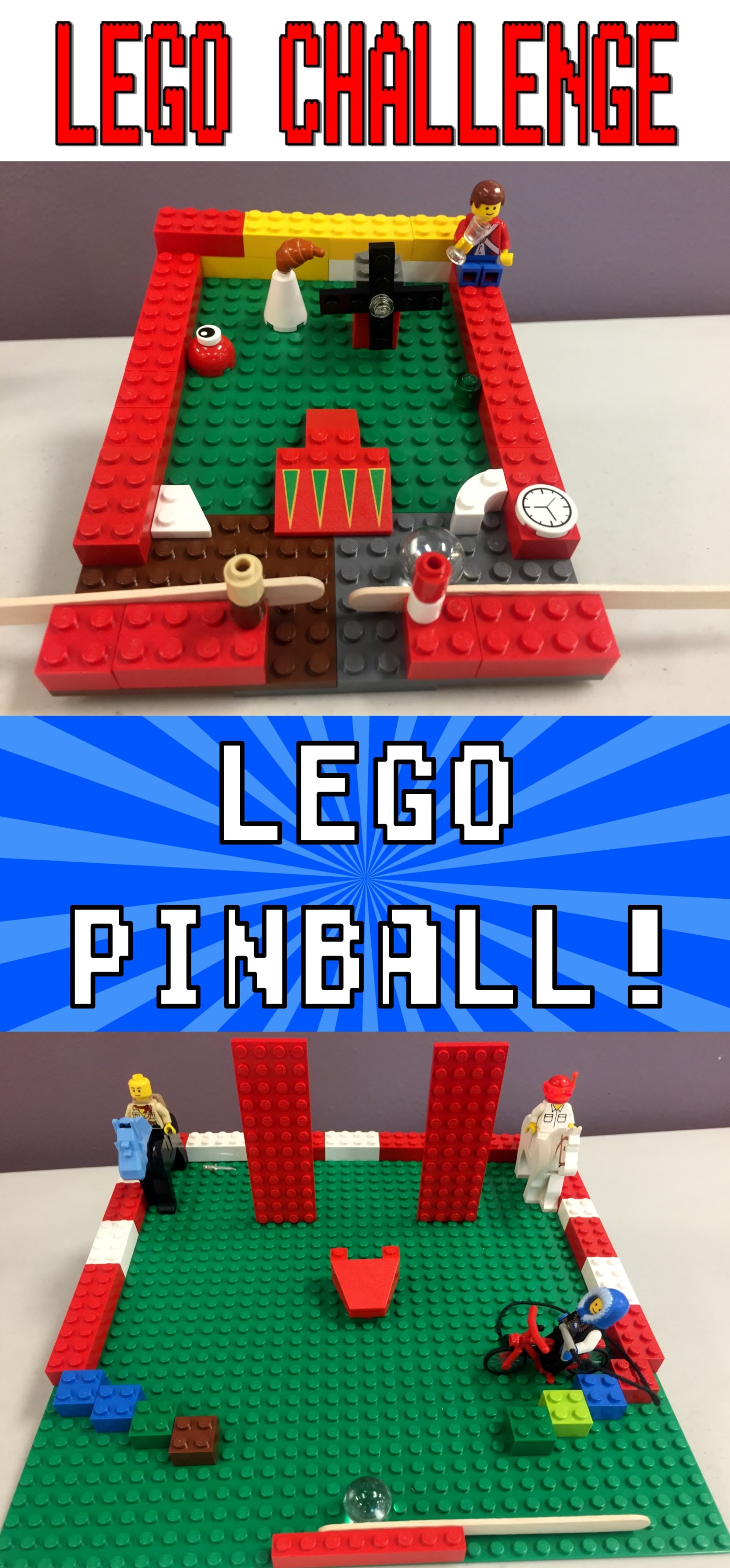 This one turned out pretty good! I like doing interactive challenges where kiddos can go around and test out what other kids built, like for our mini golf course challenge or our hike-and-seek challenge. So I based this off of a few photos I found online where people made pinball machines COMPLETELY out of Legos. I loved the idea but I knew I would have to make it a little easier for my littler kiddos.