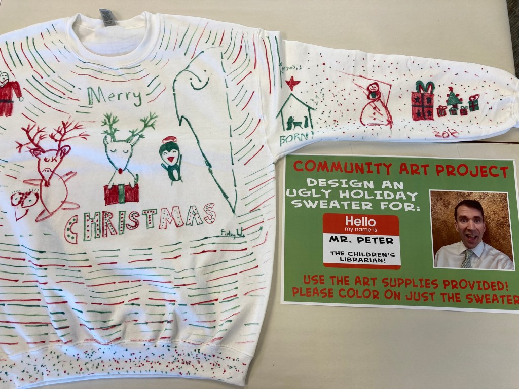 I recently did this at my new library, and it’s still a big hit. I had a white sweatshirt out for every full-time staff member, and the kids (especially older kids) loved doodling on them. I just made it a little simpler this time around, by only having out permanent markers–no paints, glitter, anything like that. This is STILL a must-do program for any holiday celebration.