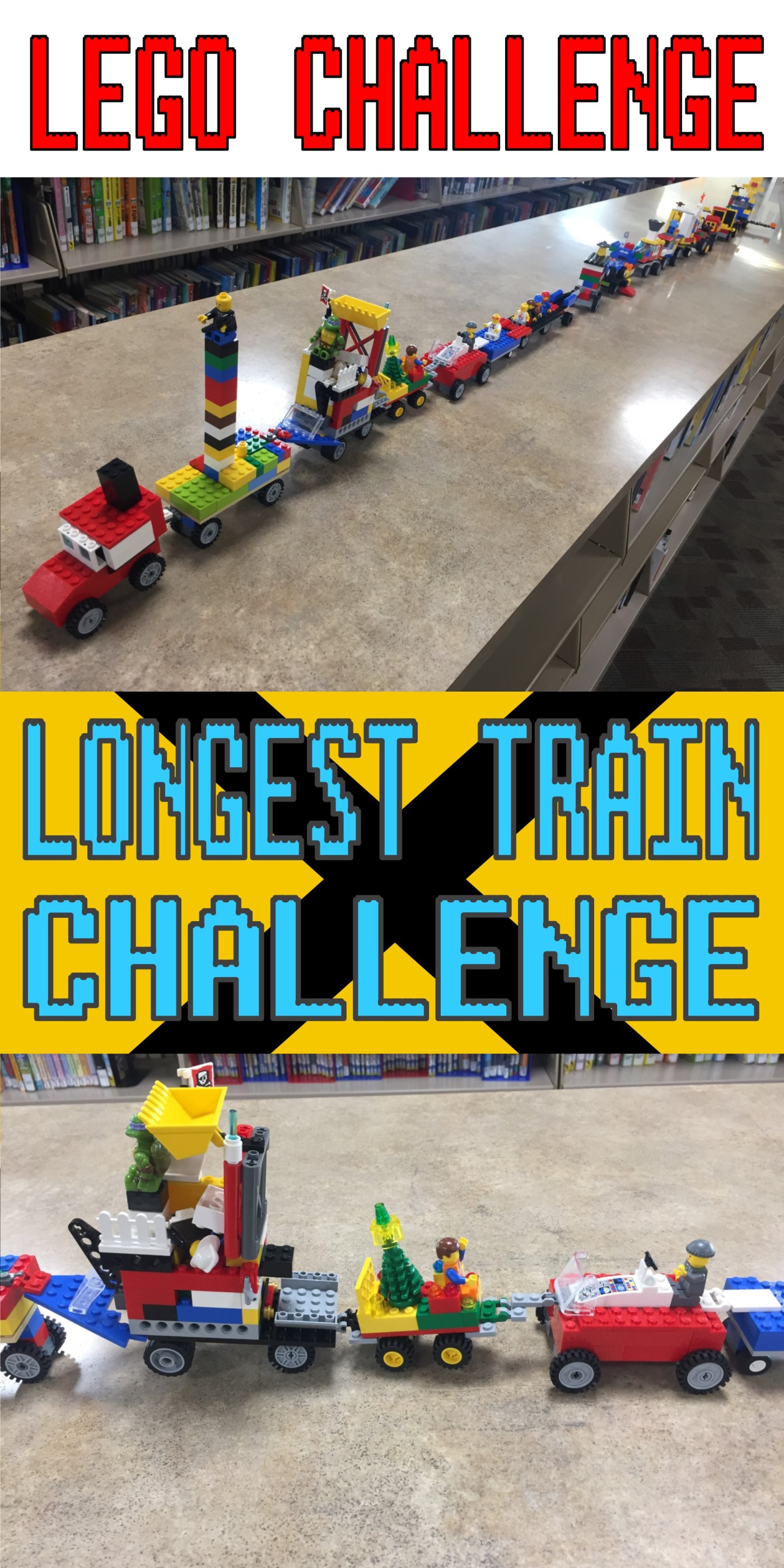 Once kids started building, I showed them the example I built really quick. Basically all I was asking for was some sort of hinge or bendy piece in both the front and back of their cars. That way everything could be linked up a bit easier than just used a regular Lego as the connection. Plus it gives a bit of a STEM element to the whole challenge. Most kids got it, but during my rounds I kept my eye out for extra hinges and other good connector pieces, since I knew kids would need some last minute help getting their train cars ready.