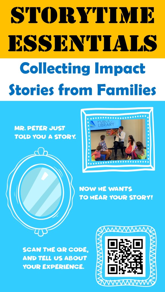 Collecting impact stories is essential for a variety of reasons. First it’s a great way to just log some of your favorite families, so that you have something to look back on. But it’s also great to know what’s working so that you can keep making your storytimes and programs special–no sense in reworking something that IS working. It’s also great for morale and to feel appreciated with what you do–someone that may not come up to you after a program to tell you that you did a good job, might rather fill out a simple form below. It’s also great for interviews or performance reviews to have actual quotes from patrons and families that you have helped. And lastly, given some of the recent news, it’s always great to get some community support.