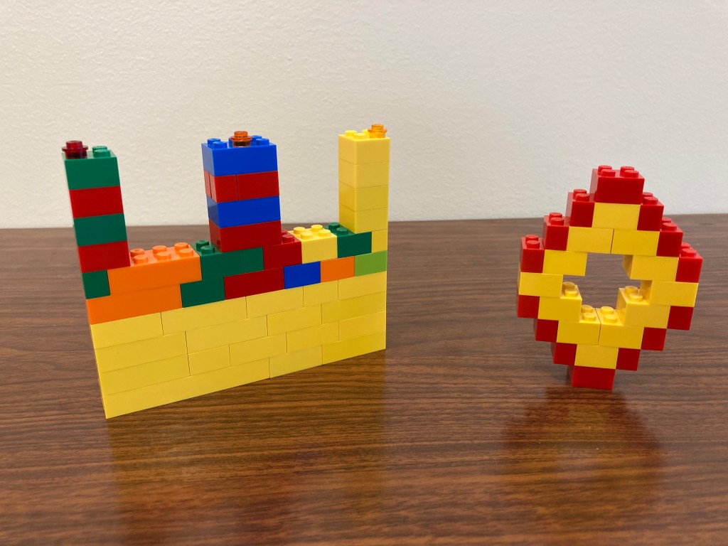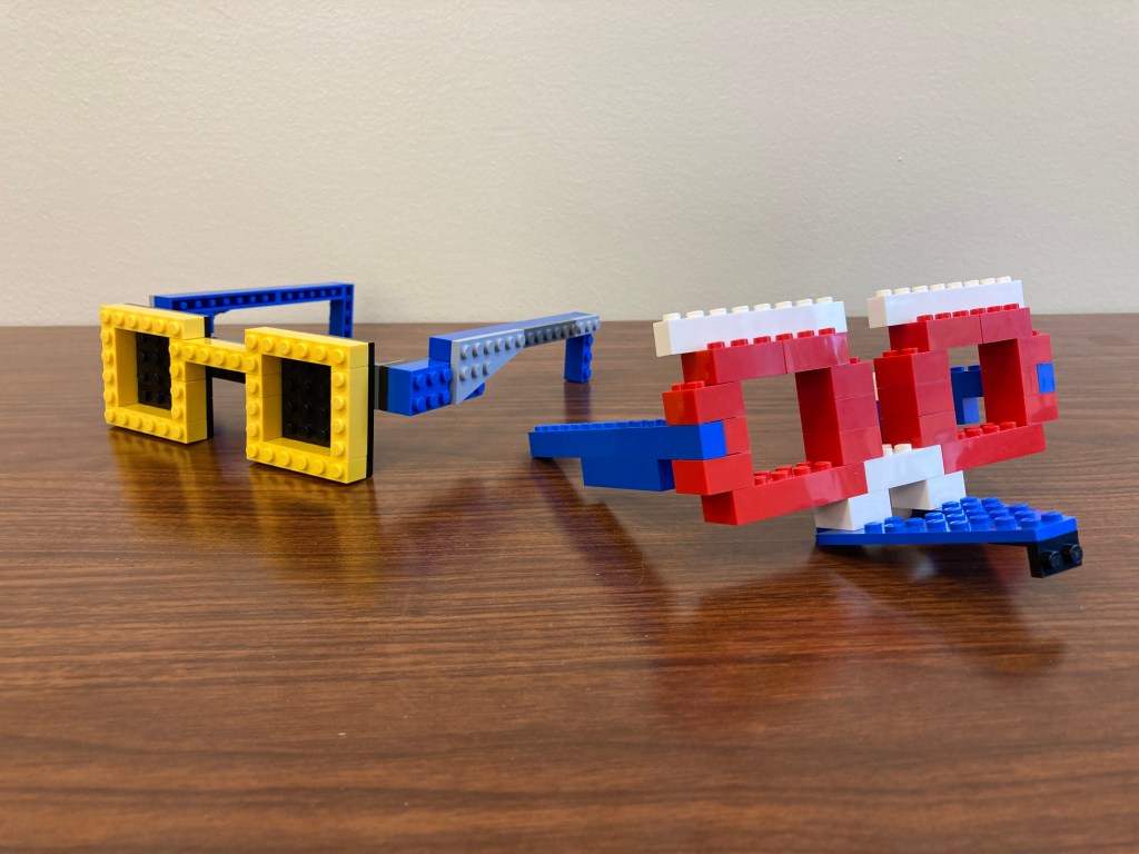 I finally did this one, and it went pretty well. This one was harder, so I gave some ideas upfront. I also explained the idea as building “photo props” so that cleared up some of the confusion too. I then went around and showed tables my examples, but then also asked my kiddos if they had an ideas of their own, so I could either help steer them or just encourage them. Maybe half didn’t do the challenge, but the other half definitely tried. I got some really great builds–feel that the girls really took to this one, so great on that front too.