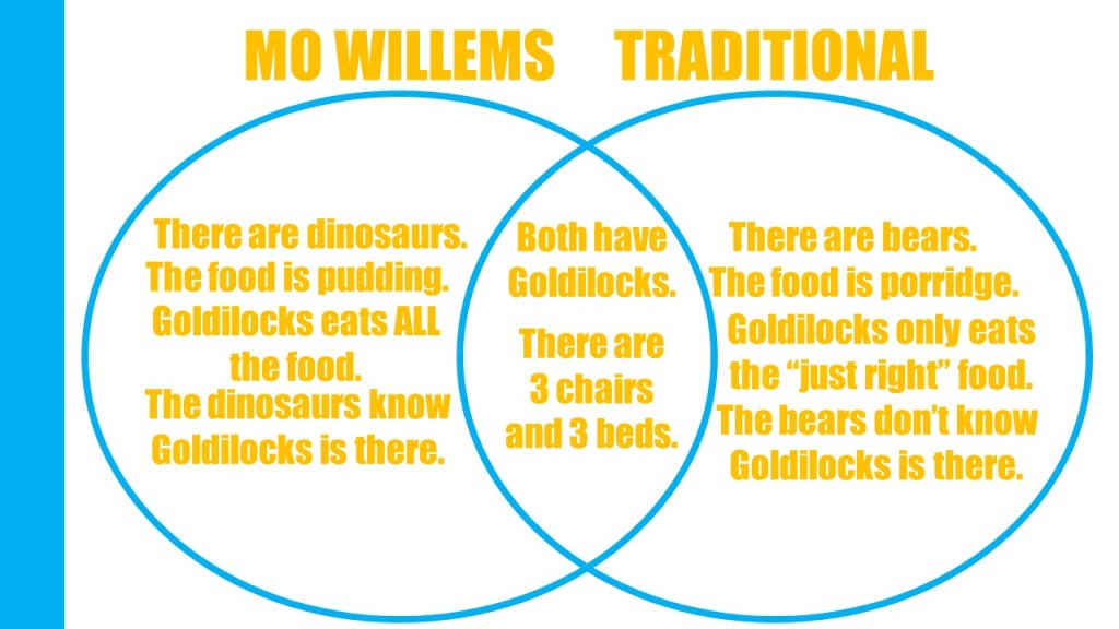 From there, we get into our storytime for the day which is “Goldilocks and the Three Dinosaurs” by Mo Willems. Amazing story. BUT I tell my kids to pay attention because at the end, we are going to compare and contrast this story from the traditional one most people know. In the end, the diagram looks like this: