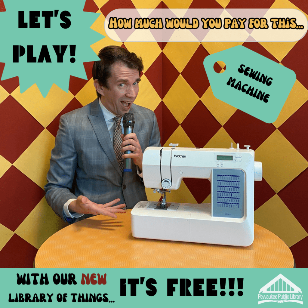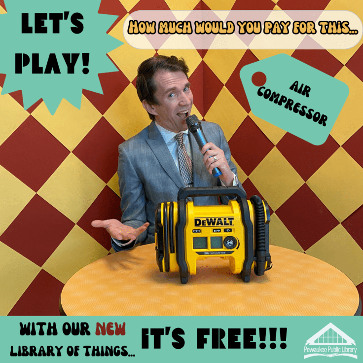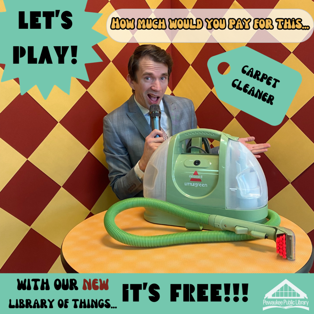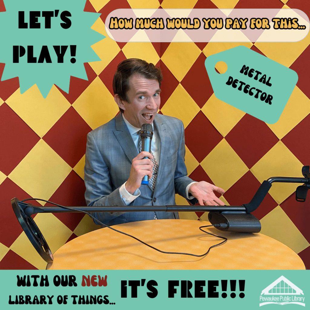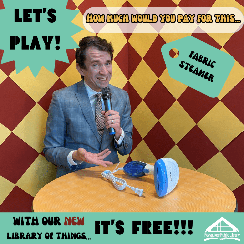 Our library just started a Library of Things collection, and I was assigned to help promote the collection. So to help advertise the new collection while also making it stand out from other libraries, I designed an ad campaign to help generate interest. I like dressing up and I think old photos are always interesting or funny, which usually provides great audience engagement. I originally thought about doing a “Guess what we DON’T have?” video, where people guess the one of three choices–two things would be from our collection, one wouldn’t be. That seemed too complicated, but that got me thinking about GAME SHOWS!! So I settled on this design.