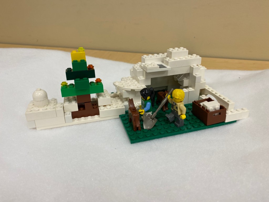 What’s so great about this challenge is the displaying of it. Kids and families always love looking at the Legos on display, but sometimes it’s hard to show what the theme or challenge was without some sort of signage. Here–everyone gets it instantly. JoLynne adding that layer of snow on the shelf helps add to the effect. And it blends in well the rest of your library holiday decorating. So kids are basically decorating your library for free!!