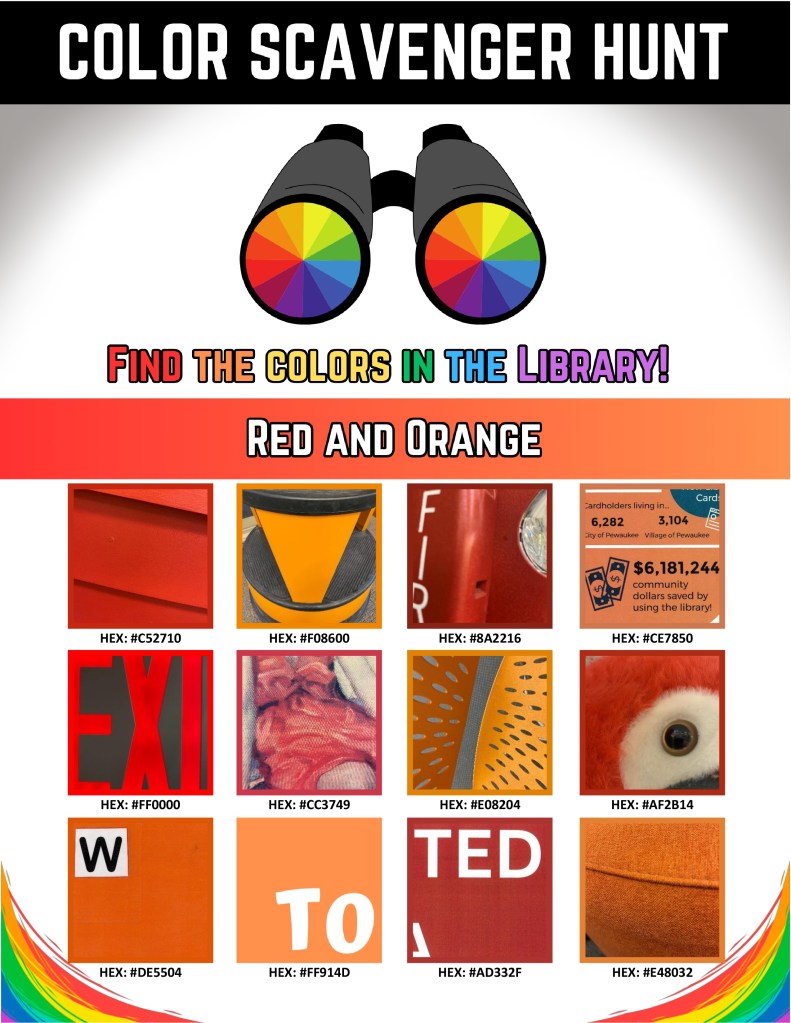 So I thought it would be a great idea to incorporate all the colors we have at the library into a scavenger hunt. Or should I say the few colors we have–if your library is anything like mine, your color palette is brown, beige, and tan.