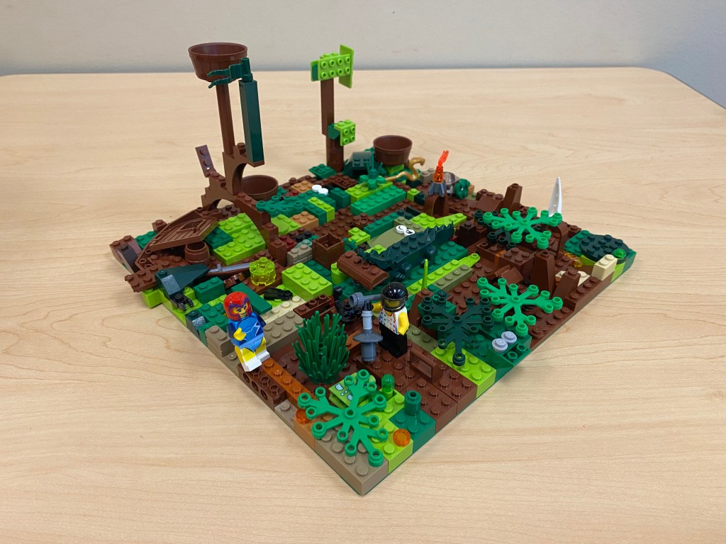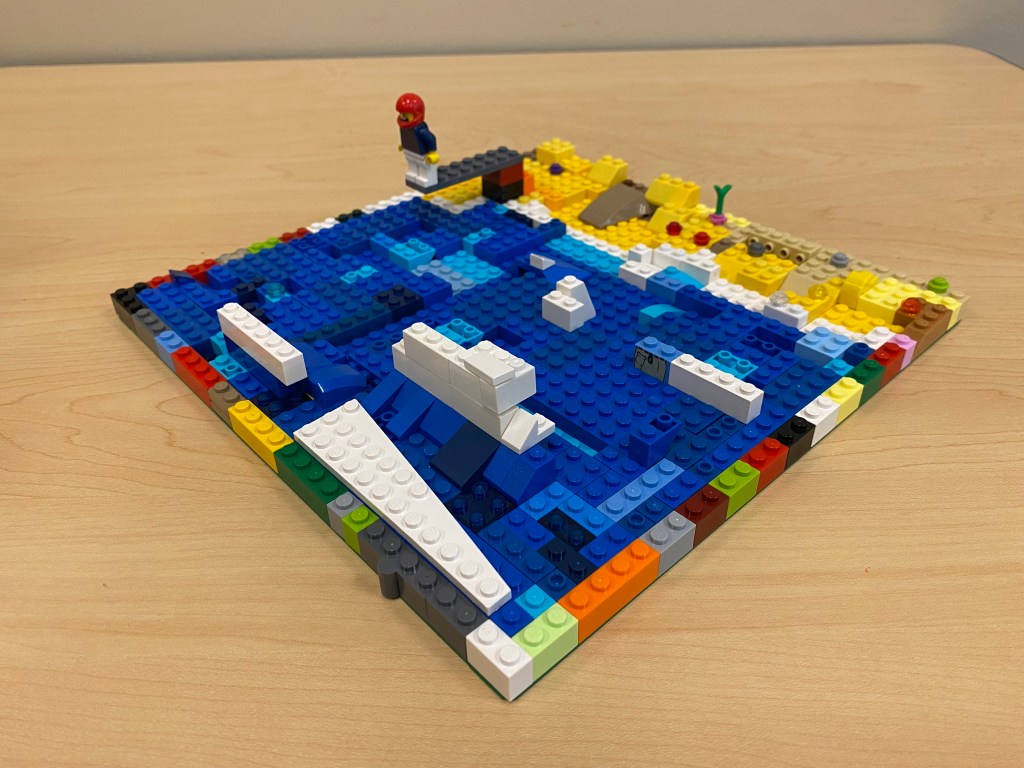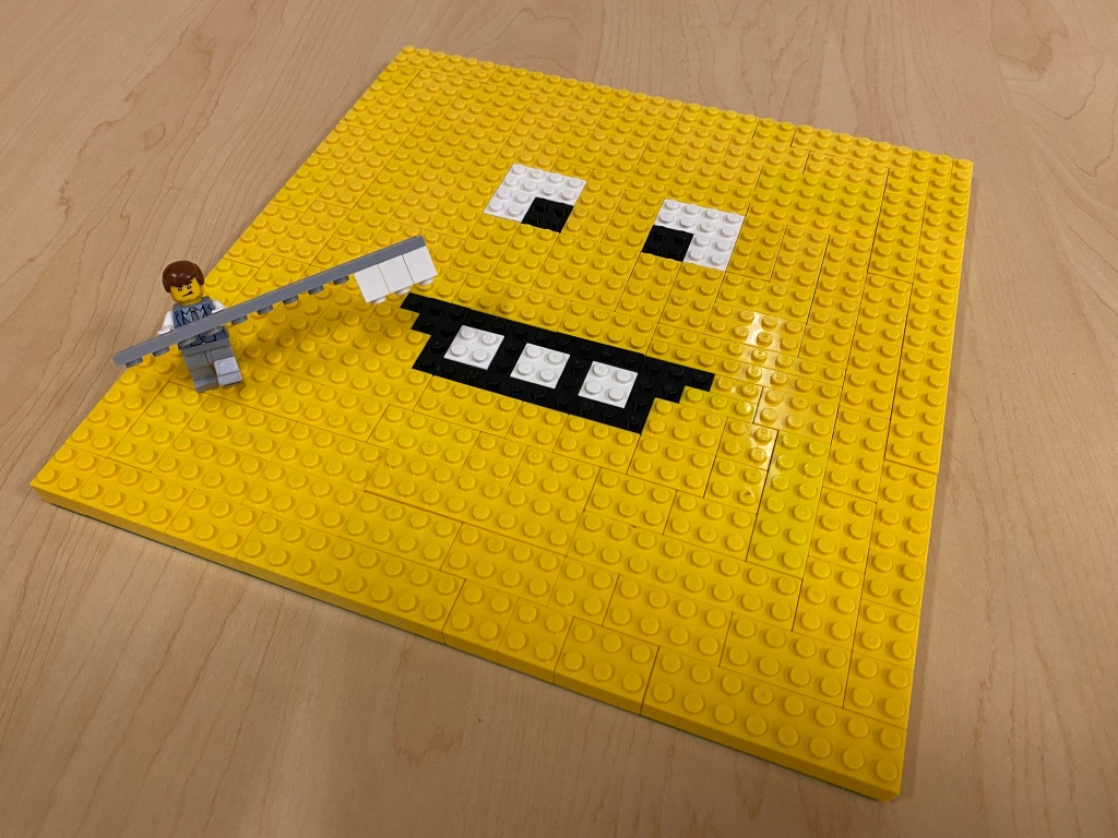 So after going over rules, we talked about what a Lego plate or base plate is, and that the challenge was to build whatever you want but fill the whole plate. Building up is totally fine, but everything on the plate should be covered. So I tried to inspire them idea like ocean or forest themes, since it’s real easy to fill up the plate and make it look cohesive if you do that. I showed them my example of a big face with a little Mr. Peter holding a big toothbrush.