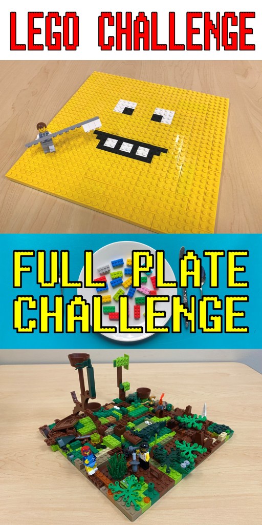 I came up with this one from just observing kids during a free build. There was one kiddo that filled up his whole Lego plate with Legos and I thought that would be a great challenge. There are some kids that just naturally want to do this, so it’s easy for younger kiddos. But there is definitely some skill involved in this one, since some kiddos will be on the hunt for the right size piece, just like a puzzle.