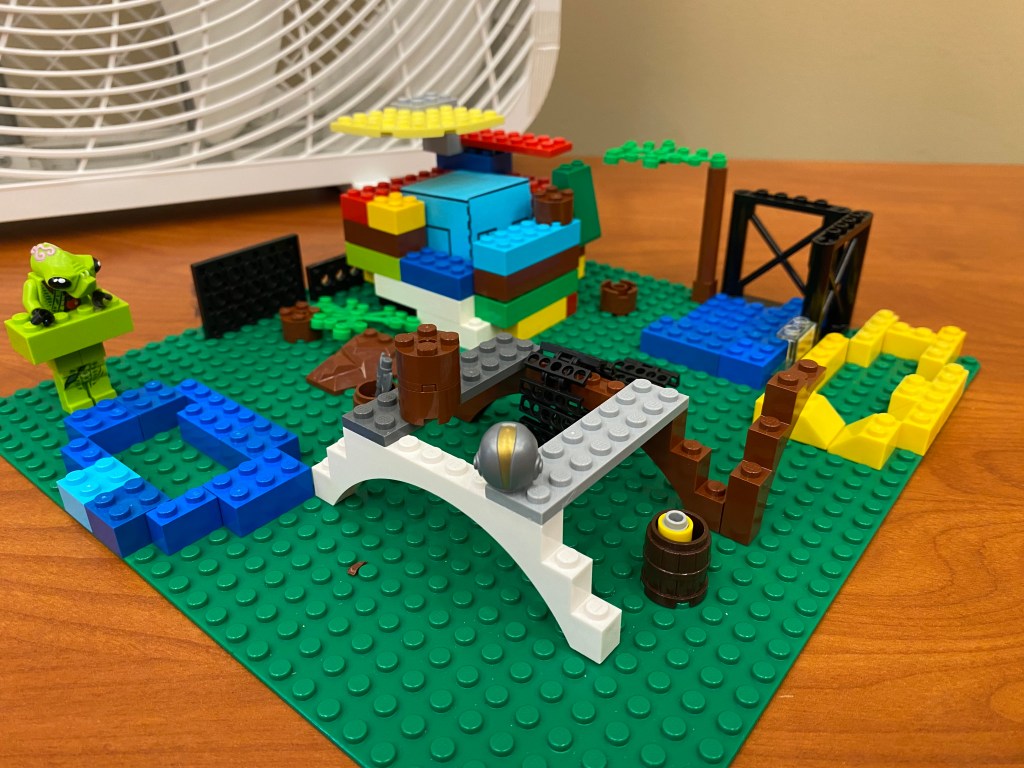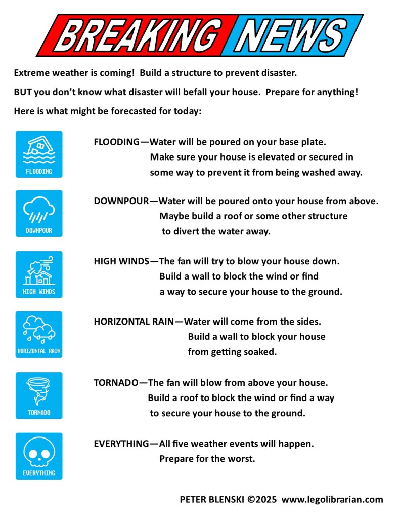 This is one I thought of years ago, but never went ahead with, but finally got around to this year. I’ve seen some STEM challenges about building a structure that can survive a “hurricane” but that’s hard to translate that to Legos, so I made it basically into an egg drop challenge, except we’re not dropping anything. And I added some other wringles that I think you’ll like.