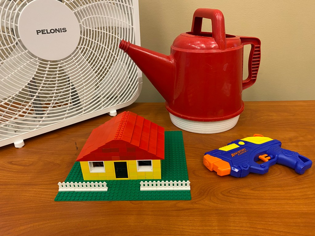 Testing was a lot of fun. I used a squirt gun for “Horizontal Rain”, and a watering can for the flooding and downpour. For “Flooding” I would pour water around the base plate but not directly on their structure, and for “Downpour” I poured water right on their structure. I initially used a hair dryer for the wind, but kids thought that was boring, so I switched to a box fan. So for “Tornado”, air was used on just the top of their structure, while for “High Winds” the fan was used on the sides of the house to see if it would blow away. For the actual tests, I just rolled the big dice to see what would happen, and then did the appropriate test that I mentioned above. For tests involving water, I put everyone’s piece in a wash tub to avoid water getting everywhere. Again, “Everything” was a favorite, and kids loved seeing water getting dumped on what they built.