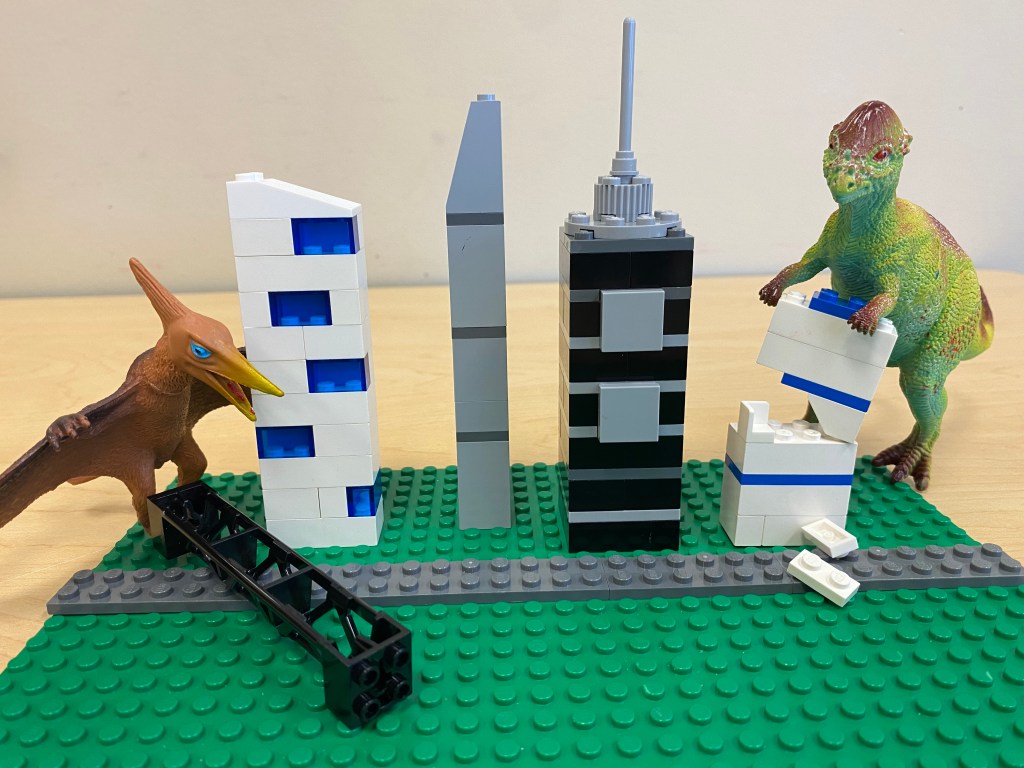So after going over rules, we talked about different dinosaur scenes we could do. I threw out a different ideas for kids to try out. They could do a “Godzilla” scene where their dinosaur was destroying buildings. They could do a “Jurassic Park” scene with a dinosaur in a zoo or breaking out of a cage. They could do a “Flintstones” scene with a dinosaur in a home helping out (I did have one kid that said “What’s Flintstones?” haha.) Or they could just do a scene with dinosaurs doing whatever of course–no wrong answers.