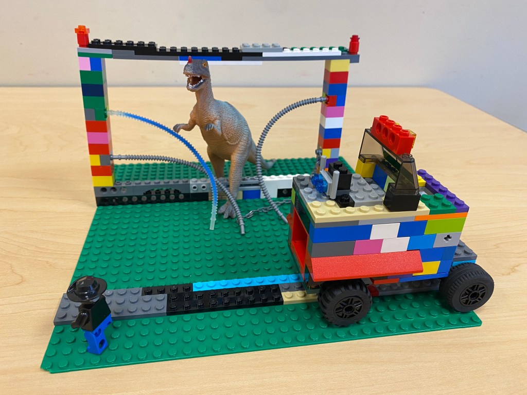 The CSLP theme this year is “Dinosaurs” so wanted to try a challenge involving that. I have a bunch of toy dinosaurs from other programs, so for me there was no extra prep at all, I just had an extra bucket next to my normal bucket of minifigs.